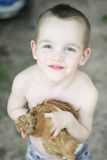 This is Eli.  He's our chicken wrangler.  The hens have been confined to the coop for a week or so (after making several daring forays into the neighbor's yard).  But when they were free-ranging in our yard it was not uncommon to see him running around with a chicken or two under his arm.  He took them with him in the trampoline enclosure, put them in the grill (which was thankfully off), and even brought them inside to freak unsuspecting house-guests out. We also frequently heard him tell them, very sincerely, "I love you shicken"